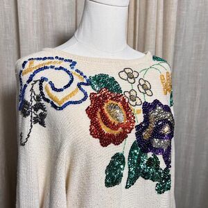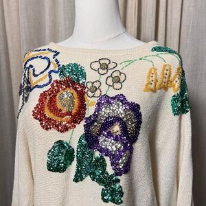 This sweater is a true statement piece with bold floral beading, perfect for collectors of unique vintage knitwear or anyone looking to add a touch of artistry to their wardrobe.
