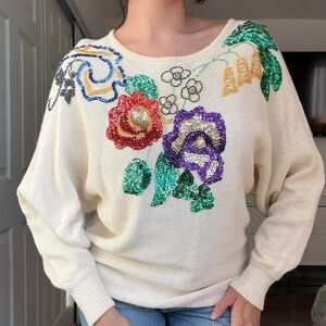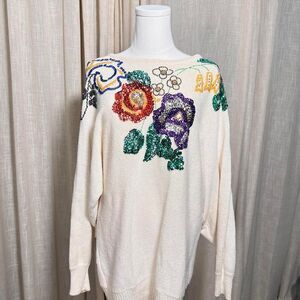 beaded floral, vintage sweater, statement knit, embroidered embellishments, colorful beading, relaxed fit, textured knit, floral applique, artisanal design, retro style