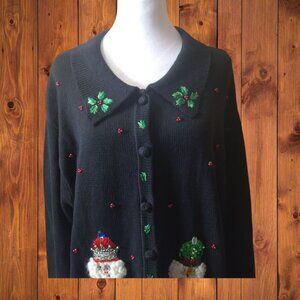 Victoria Jones Woman size 1X black button front cardigan is collared and has embroidered holly and the berries are beaded. It has different nutcrackers on the front that are beaded, sequin and embroidered. They are 3D.