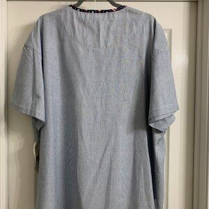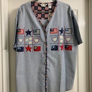Cute, vintage striped denim shirt with embroidered flags, stars, flowers. Short sleeve. NWT. Size 24W. Full button front closure. Material is 100% cotton. Smoke free/pet free home.