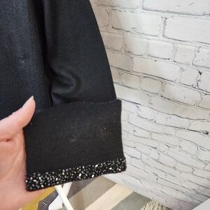 This lovely elegant lightweight beaded cardigan with sewn in shell top one piece features beaded detail design down front button line and cuffs. The sleek black color adds a touch of sophistication to your wardrobe. Perfect for any dressy occasions,, holiday or any night on the town.