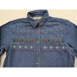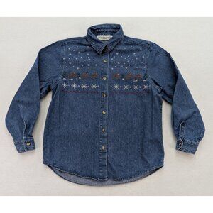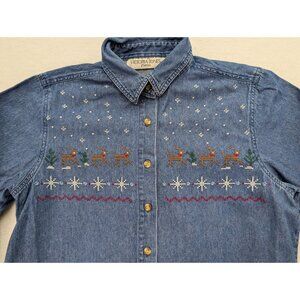 Victoria Jones Women's Top Size PM Christmas Reindeer Embroidered Denim