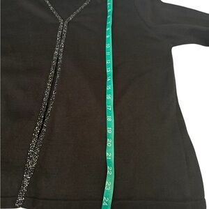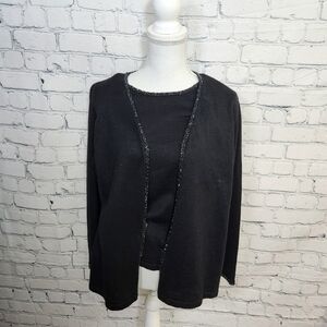 Elegant lightweight black sweater with attached shell features a beaded trim. Perfect for a stylish look.