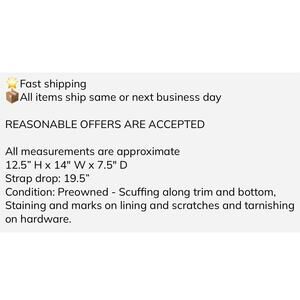 Condition: Preowned - Scuffing along trim and bottom, Staining and marks on lining and scratches and tarnishing on hardware.