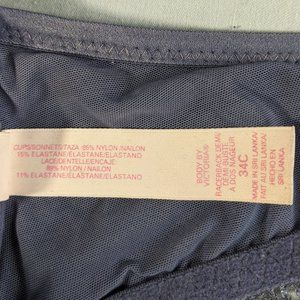 Victoria Secret blue 34C Body By Victoria lined Demi cup bra with front closure! Good used condition, original owner! Soft cotton texture on cups with a tiny, delicate lace along the edges of the cups and up along part of the shoulder straps. Racerback strap style with a front close that slides in and snaps closed and original care tag and underwire. There is some minor pilling on the straps and cups and the lace has a small snag (pointed out in photos). Cups: 85% nylon/15% elastane, Lace: 89% nylon/11% elastane. Some pictures make it appear there are dark marks or stains, but, it's just the shadow from the lights. Please see all pictures for wear/condition. Pictures are of actual bra. Pet free, smoke free household. Please let me know if you have any questions, thanks for looking!