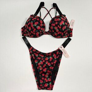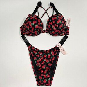 Victoria Secret 34D M Bombshell Push Up Top Bikini Set Shine Strap Cherry Print