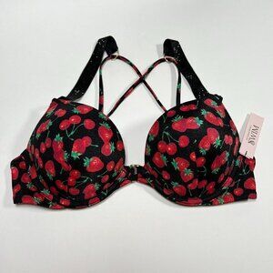 Victoria Secret 36C Bombshell Push Up Bikini Top Shine Strap Berry Cherry Print