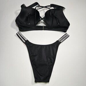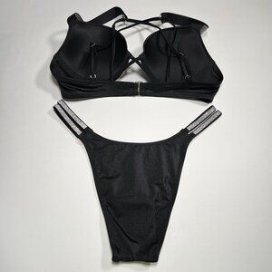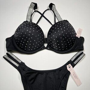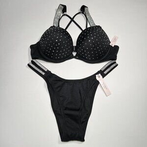 Victoria Secret 36DD L Bombshell Push Up Bikini Top Set Glam Shine Strap Black