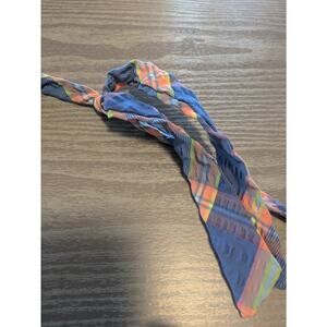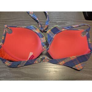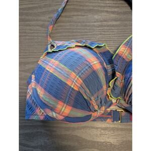 Victoria Secret size 38C Halter Tie Neck Ruffle Bikini Swim Top. Heavily padded, push up style with underwire. Blue, neon orange and green plaid. Nylon elastane.