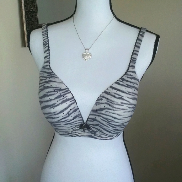 Zebra print light/dark gray lightly lined wireless bra w/black crystals