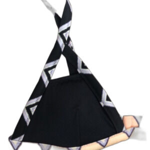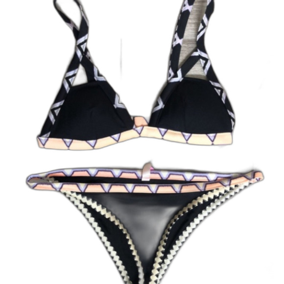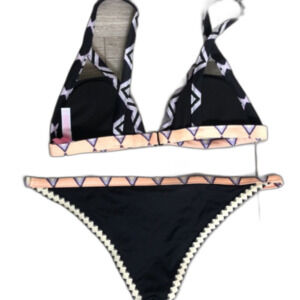 Black VS bikini with tribal trim in a pretty coral and lavender color. Bra shaped top with no ties for comfort.