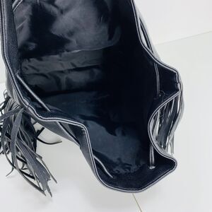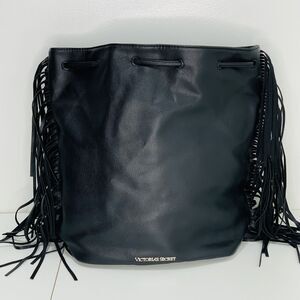 Victoria Secret Black Faux Leather Backpack Bag Fringe Large Boho Festival. Condition is Pre-owned.
