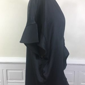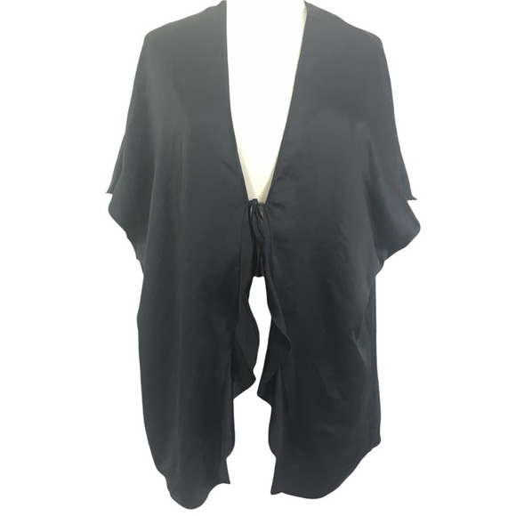 Beautiful tie front black silky cover up kimono. Ruffle flutter detailing on the sleeves and front.