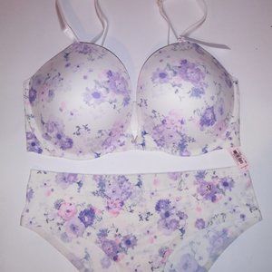 Victoria Secret Bra Set 34DDD Push Up Plunge Small Hiphugger Panty White Purple