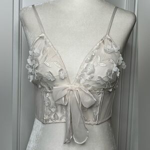 The freshest of bouquets, a sheer long line bra that's beyond dreamy with 3-dimensional floral applique' details and a chiffon bow in front.