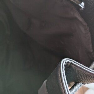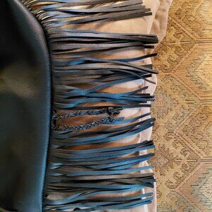 Victoria Secret Black Faux Leather Bucket Bag with Fringe on both sides. This bag is pre-owned, in good condition. The fringe and the strap are in good shape, no tears, no marks. The interior is also black, so difficult to see in the photos, but there are no tears or rips or odors. The bag is basic, with no interior or exterior pockets. The Fringe is the showcase for this bag, and while it is a large bag, it is lightweight. The draw cord on the top closes the bag, and the draw cord in the back can be worn across the shoulder or like a backpack. When you close the bag by pulling and adjusting the draw cord, it changes the look (see last picture) and it then becomes a backpack. It's a cool purse, especially with the fringe. Measurements are Length, 15 inches, Width 15 inches when completely open. Fringe is 7 inches long.