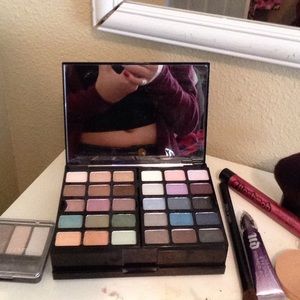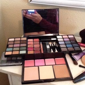 Includes: 30 silky eyeshadows, 10 perfect lip glosses, two unused eyeshadow brushes, One lip liner, two unused lip gloss brushes, One unused blush/bronzer brush, One on used Victoria secret mascara, four blushes, One bronzer, One luminous powder, One translucent powder. the eyeshadows and lipglosses are slightly used (i used thwm with my own brushes). Since its used i dropped the price tremendously. Willing to trade:)
