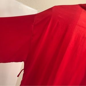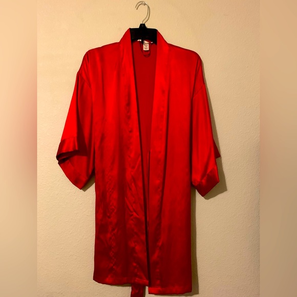Ruby red sleepwear robe, size XS but runs big and fits more like a medium. Loopholes for string to go in are still intact with a robe belt as well. In good condition. It has one tiny tiny black dot on back of robe (left shoulder area) not noticeable at all. (Originally $60 + tax)