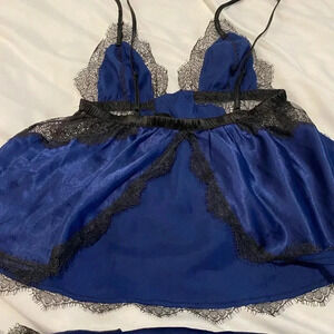 NWOT Victoria Secret Lace Cami Short Set Black & Navy Blue. Never worn. Size small. See photos & videos. Cover picture shows details of lace.