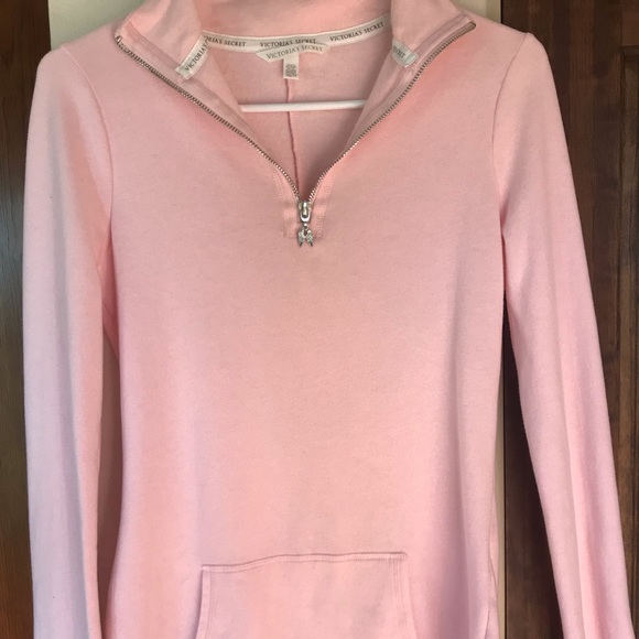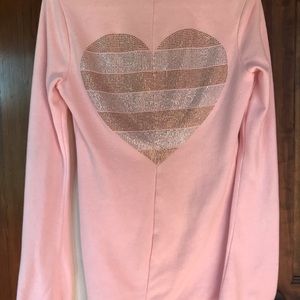 Light Pink 1/4 zip. Tunic length, very soft. Rough edge hem, Silver and Gold Bling Heart on the back. Size XS