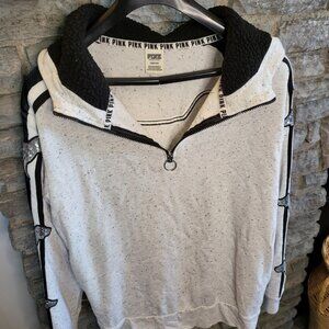Victoria Secret Pink Bling Sequin Logo Dog Hooded Pullover 1/4 Zip Gray Black LG