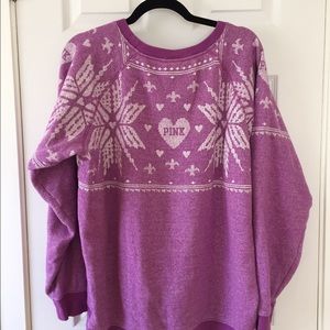 Holiday 2013 Victoria Secret Pink Boyfriend Crew Sweater. It is so cozy and soft. It's size medium but these are quite oversized. I have a few of these which is why I'm letting this one go as I clean out my closet.