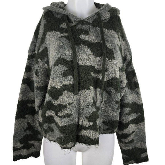 Victoria Secret Pink Green Camouflage Tight Knit Fuzzy Hooded Pullover Jacket L