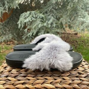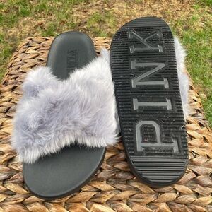 Victoria Secret Pink Retro Gray Fuzzy Fur Limited Edition Slide Sandals. Size Medium, fit women sizes 7/8