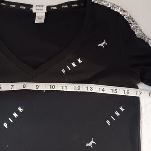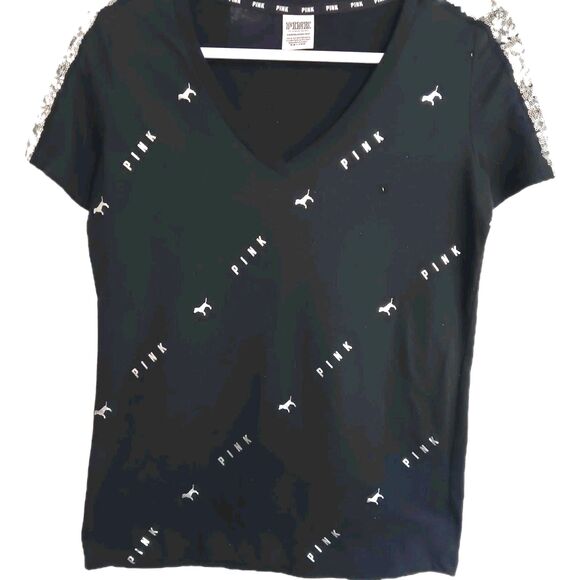 The Victoria's Secret Pink top in size XS features a black color with silver dogs and logo accents, accented with sequins at the shoulders for a touch of sparkle. Made from a comfortable cotton blend fabric, this relaxed fit T-shirt has a round neckline, short sleeves, and a pullover closure, making it perfect for casual occasions in the summer, fall, or spring. The lightweight and stretchy material ensures a comfortable and stylish look for the modern woman who loves the brand's iconic style. Armpit to Armpit 17in length 24in sleeve 7in