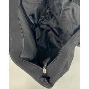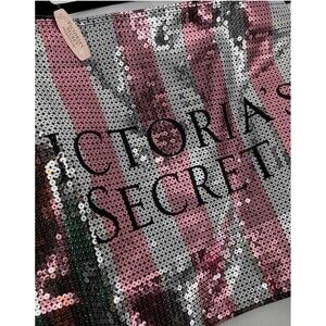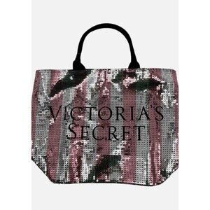 The Victoria Secret Pink Silver Sequence Striped Canvas Tote Bag is a stylish shopping weekender perfect for casual travel. This large rectangular bag features a zip closure, double black canvas handles, and a black lining. The exterior is a vibrant combination of pink, silver, and black stripes with sequin accents, giving it a playful and beachy look. The classic design and love-themed details make it a versatile accessory for any outfit.