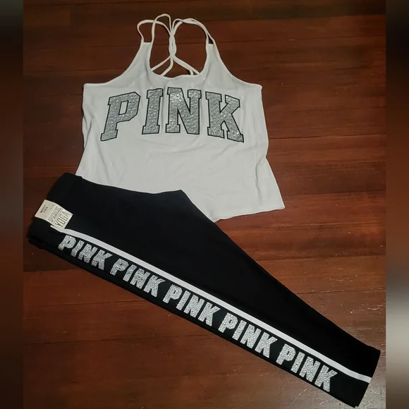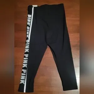 Black Leggings with rhinestone "PINK" detail going down right leg. Perfect Condition and new with tags. No Flaws!!!