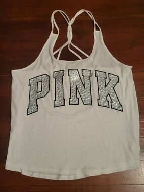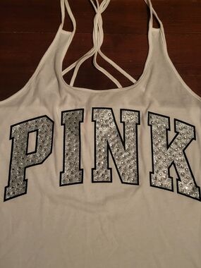 White Rhinestone Tank Top with giant Rhinestone "PINK" on front and strappy detail on back. Perfect Condition and new with tags. No Flaws!!