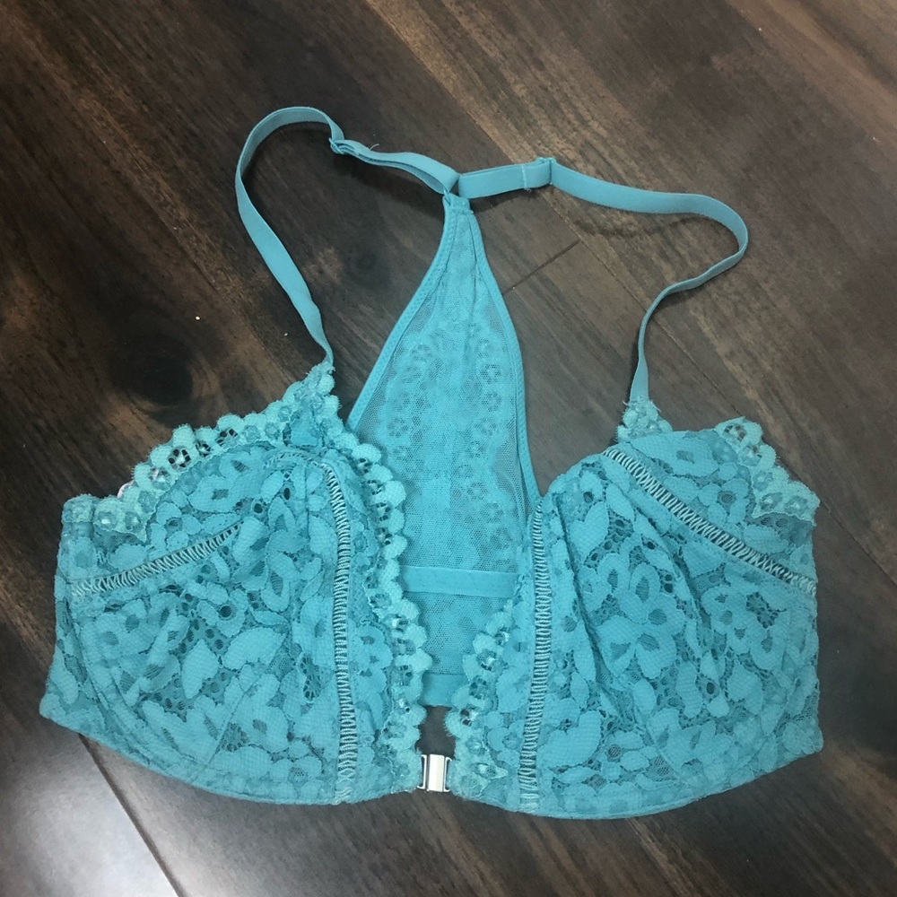 Adorable Victoria Secret razor back bra with the clip in the front. Teal color with some lace detail. It’s not padded so you could see your boobs through the lace a little but the coloring helps that also