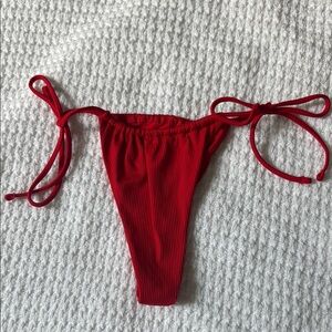 Stylish red bikini bottom. Features adjustable side ties. Perfect for beach days. String tie sides. Thong.