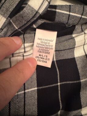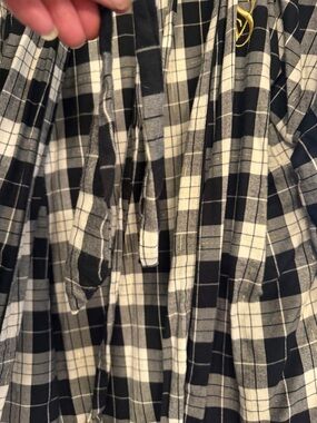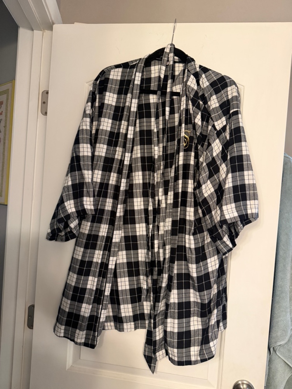 Beautiful light weight robe in black and white plaid. Only tried on. Comes with a rope belt and the 2 loop holes are in perfect condition. VS golden embroidery on the chest. Shorter sleeves and shorter length.