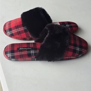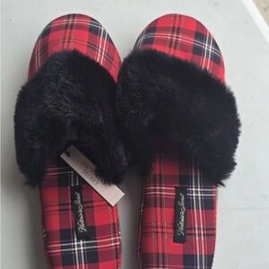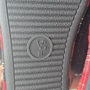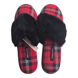 Victoria Secret Slippers Women Red/Black Plaid Fur Signature Mule Satin Sz M (8)