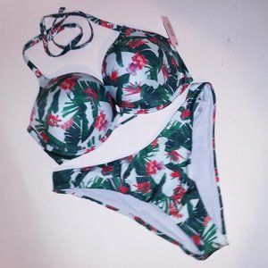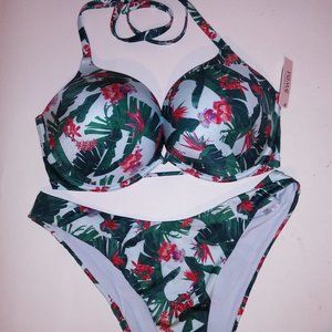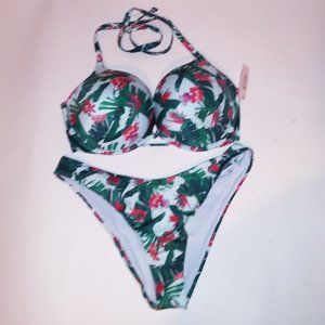 Victoria Secret Swim Bikini 38D Top XL Bottom Blue Green Leaves Bombshell Push U