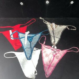 Set of five new thongs in various patterns and colors. Includes blue zebra, red, white script, pink plaid, and leopard print designs. Size L