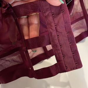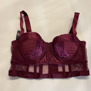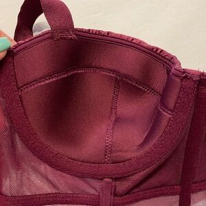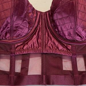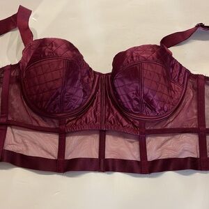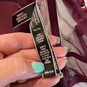 COVER PHOTO IS TO SHOW FIT!!!! Bra for SALE is NOT SILVER it’s WINE COLOR Like new condition VS VERY SEXY BALCONET bra — size 34B — corset style — SATIN with quilt like stitch CUPS and front — mesh bottom front and all sides — boning for support — 7 hook cut out closure — adjustable straps — very sexy bundle to save in shipping as 2+ items ship as 1, plus discount Same / next day shipping Happy shopping