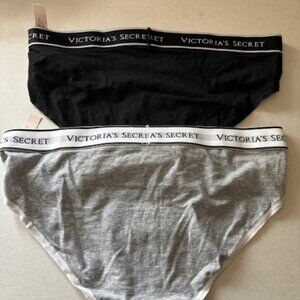Victoria Secret Women's Size M Bikini Hipster Basic Cotton Stretch Panties, Logo, one grey, one black, full coverage back. Set of 2, NWT.