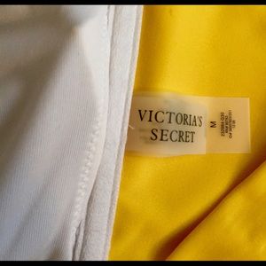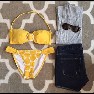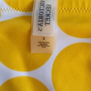 Gently worn mix and match bikini from Victoria Secret. Yellow bandeau top comes with a removable halter strap. Lightly padded. Top is a size Medium. Cheeky yellow polka dot bikini bottom. Bottom is a size Small. Fabric is 83% Nylon and 17% Spandex. 🚫No Trades🚫
