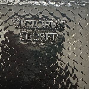 Beautiful cosmetic bag in shiny black patten by Victoria Secret with bird, bee and butterfly decal accent. Top zip closure. Width 11” x Length 8”.