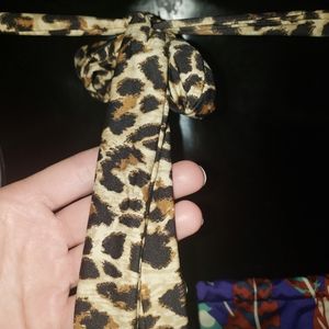 beautiful leopard print strap with feather design and wraps around neck n ties in front or back. multiple ways to wear top.