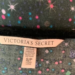 Good condition- black with multi color polka dot, small Victoria Secret logos, functional front pocket, large hot pink Victoria Secret Logo, deep v-neck neckline, collared button down