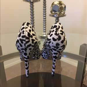 Victoria Secret spotted leopard calf hair pump. Pointed toe pump with raised angel wing decal on bottom of shoe. Brown/White Genuine Leather