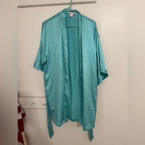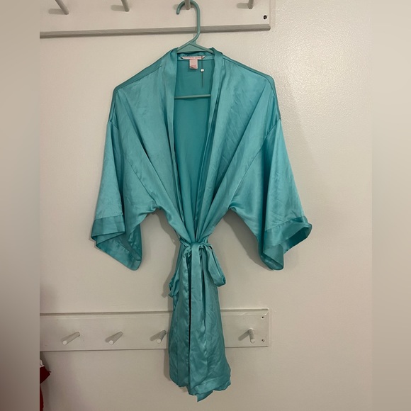Victoria Secrets blue satin robe. Size medium/large. Has pockets. Has a sash. Ties on the inside to keep the robe from showing as much cleavage. Beautiful turquoise blue color. Hits above the knee. Got as a bridesmaid gift but hardly ever wear it.