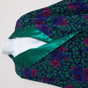 Elegant women's jacket featuring a vibrant floral design. The rich green satin adds a touch of luxury, perfect for any occasion.
