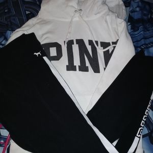 The black and white hoodie match the blank yoga pants with the stripe that says pink on the side of them this outfit was bought together and has been gently worn and no rips or tears very comfy cool outfit