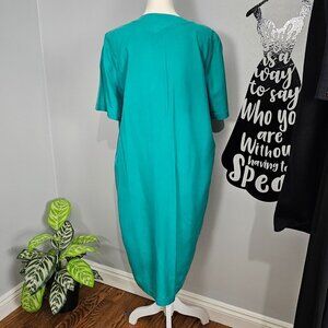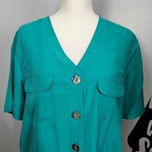 Victoria Soie V Neck Short Sleeve Vintage Silk Button Down Teal Shirt Dress Size 12