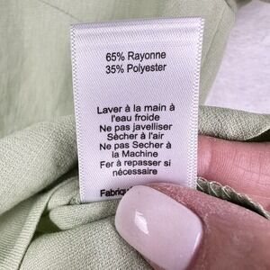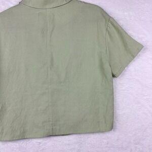 This Victoria & Sophia medium collared top features a button-up design and short sleeves. The blouse is light green in color and made of a lightweight and breathable polyester and rayon blend. It has a relaxed fit and is suitable for travel, casual, and business occasions. The top is cropped in style and has a solid pattern, making it a versatile addition to any wardrobe. It is important to hand wash only to maintain its quality. This piece is perfect for summer, fall, and spring.